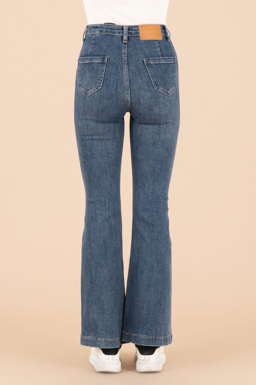 Jeans a zampa a vita alta. Modello cinque tasche. Chiusura frontale con bottone personalizzato e cerniera. Targhetta in pelle AN AIM nella parte posteriore.