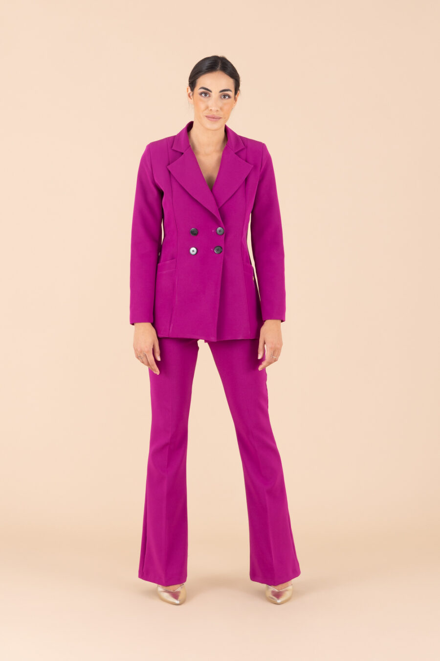 Giacca doppiopetto avvitata con collo a revers. Chiusura frontale con bottoni.