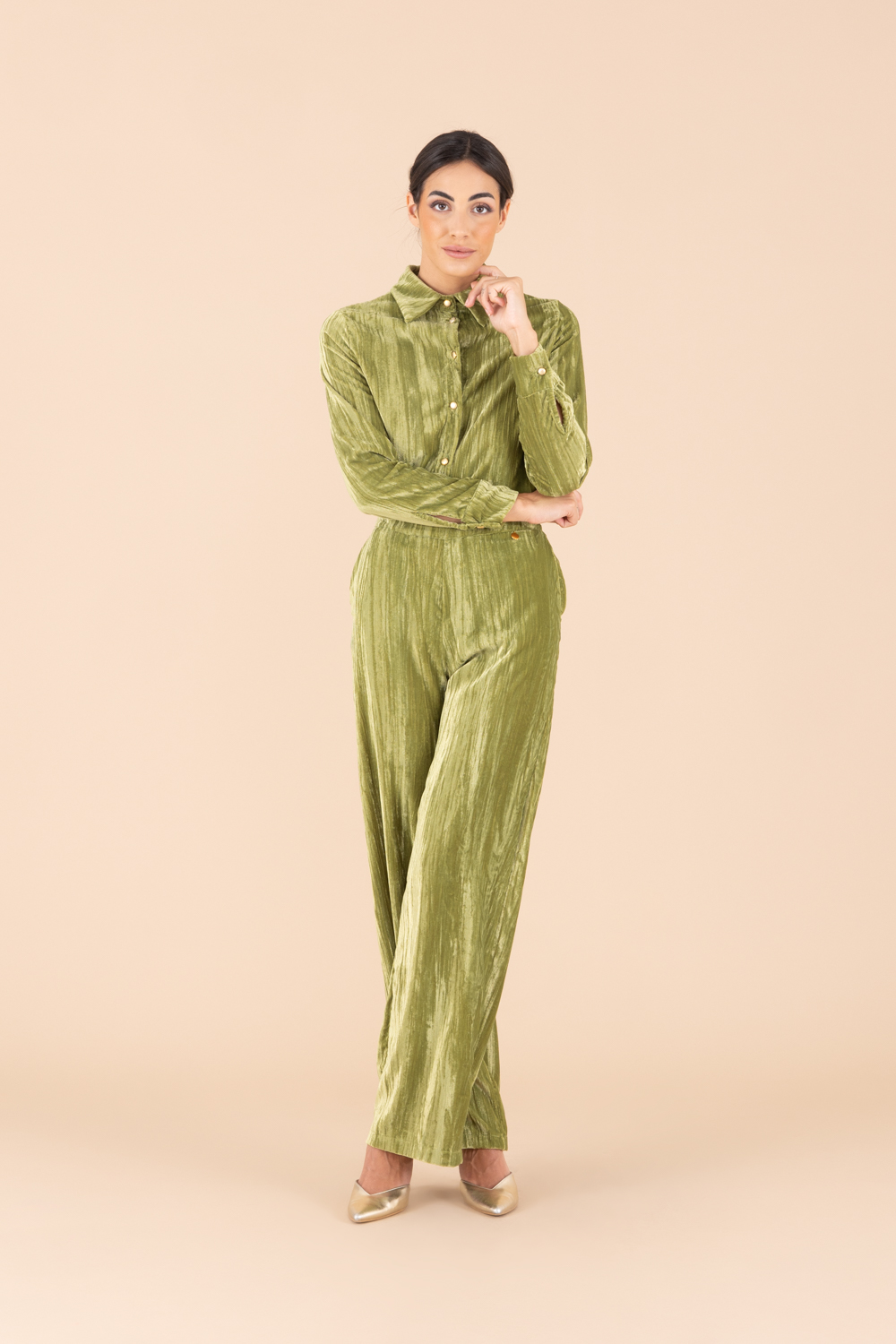 Pantalone palazzo a vita alta con tasche laterali. Chiusura posteriore con zip metallica.